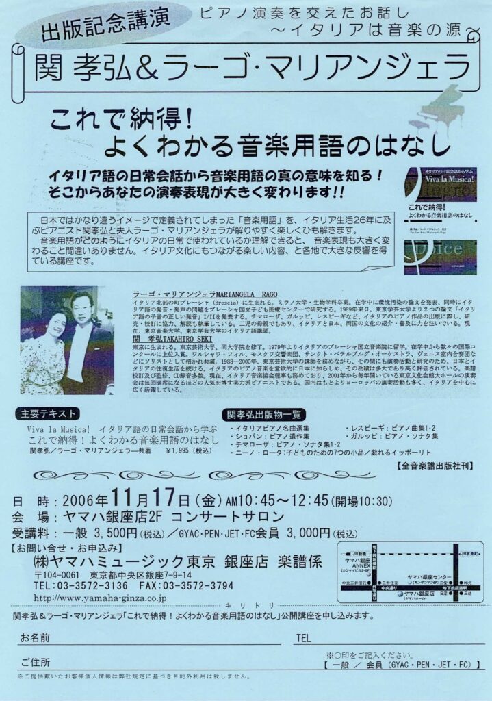 これで納得!よくわかる音楽用語のはなし 2026 3/22 2006年11月17日 ヤマハ銀座店2F コンサートサロン これで納得!よくわかる音楽用語のはな Interview 関連記事 これで納得!よくわかる音楽用語のはなし 2026年3月22日 かわさきFM 2026年3月22日 Interview 2026年3月22日 これで納得!よくわかる音楽用語のはな 2026年3月22日 イタリア歌曲の発音の勉強会 No.5 2026年3月22日 イタリアで受けた教育と日本の教育の違い 2026年3月22日 イタリア歌曲の発音の勉強会 No. 4 2026年3月22日 イタリア歌曲の発音の勉強会 No. 3 2026年3月22日