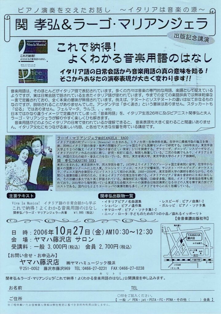 これで納得!よくわかる音楽用語のはな 2026 3/22 2006年10月27日 ヤマハ藤沢店 サロン イタリア歌曲の発音の勉強会 No.5 これで納得!よくわかる音楽用語のはなし 関連記事 これで納得!よくわかる音楽用語のはなし 2026年3月22日 かわさきFM 2026年3月22日 Interview 2026年3月22日 これで納得!よくわかる音楽用語のはなし 2026年3月22日 イタリア歌曲の発音の勉強会 No.5 2026年3月22日 イタリアで受けた教育と日本の教育の違い 2026年3月22日 イタリア歌曲の発音の勉強会 No. 4 2026年3月22日 イタリア歌曲の発音の勉強会 No. 3 2026年3月22日